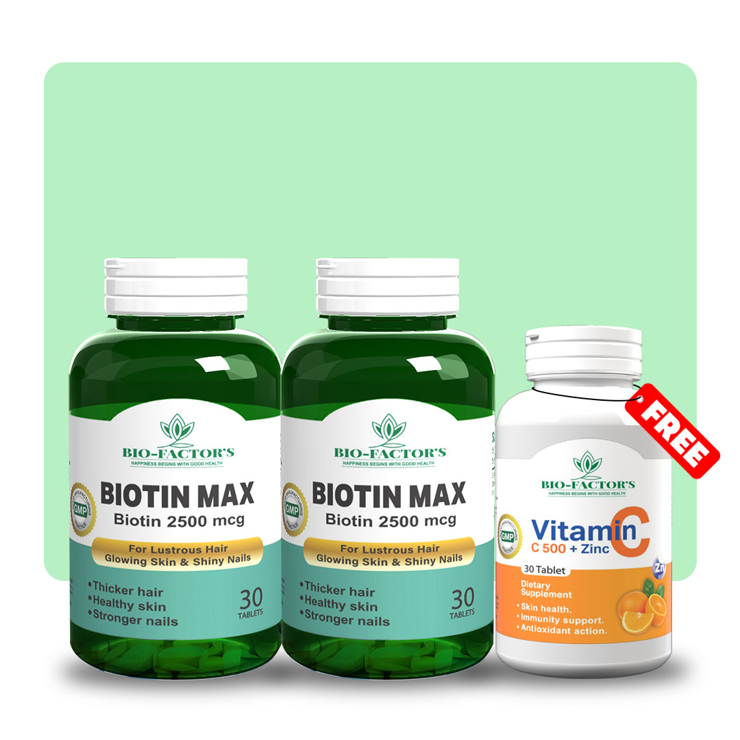 Introducing Biotin Max, your ultimate solution for promoting healthy hair, skin, and nails. Biotin Max is a premium biotin supplement specially formulated to nourish and strengthen your hair, support radiant skin, and promote strong, beautiful nails. Here's what Biotin Max has to offer: